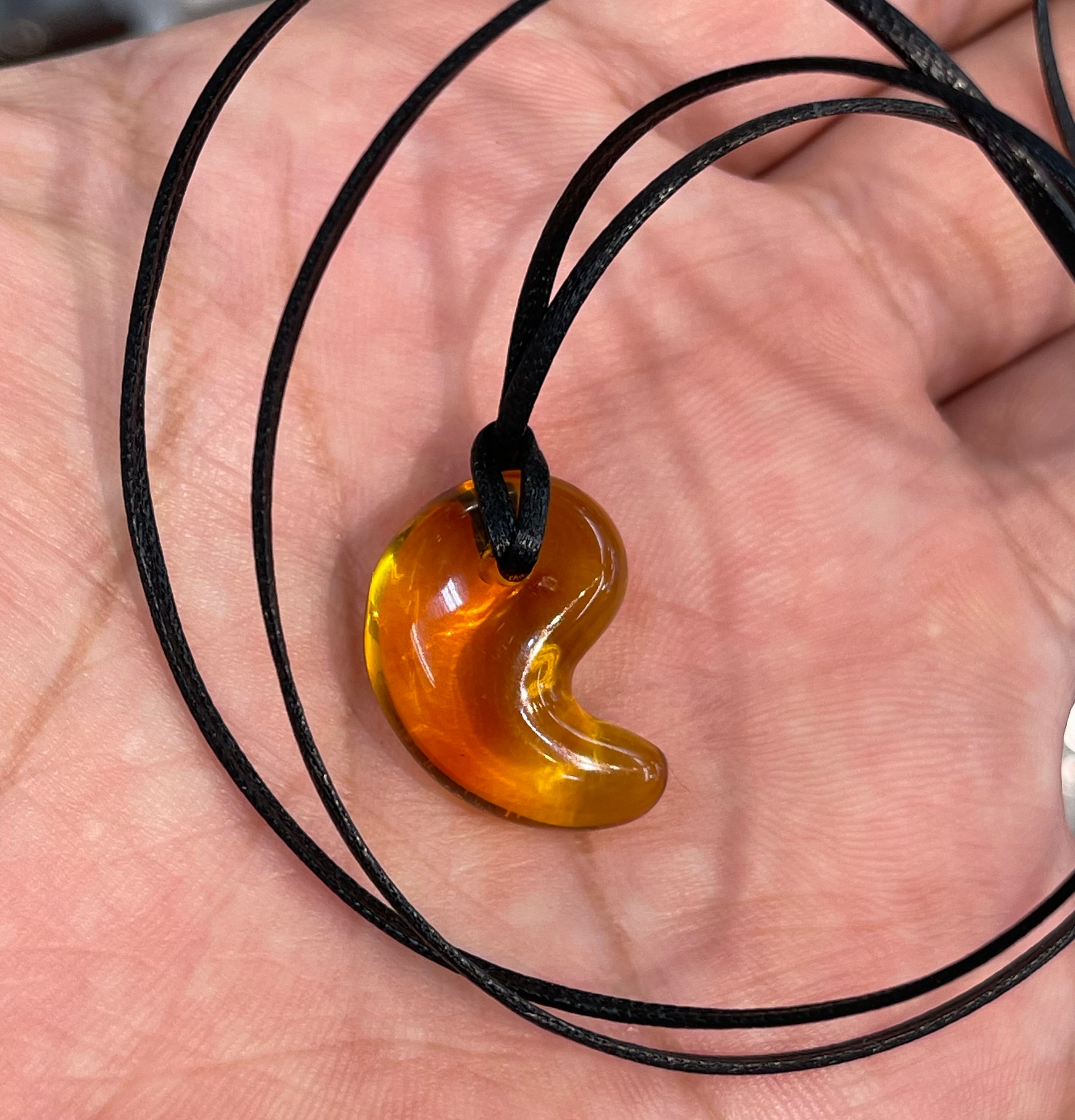 一見普通のアンバーとはなんら変りはないですが、太陽光やブラックライトなどの紫外線が当たると神秘的な美しいブルー光が表面を覆います。