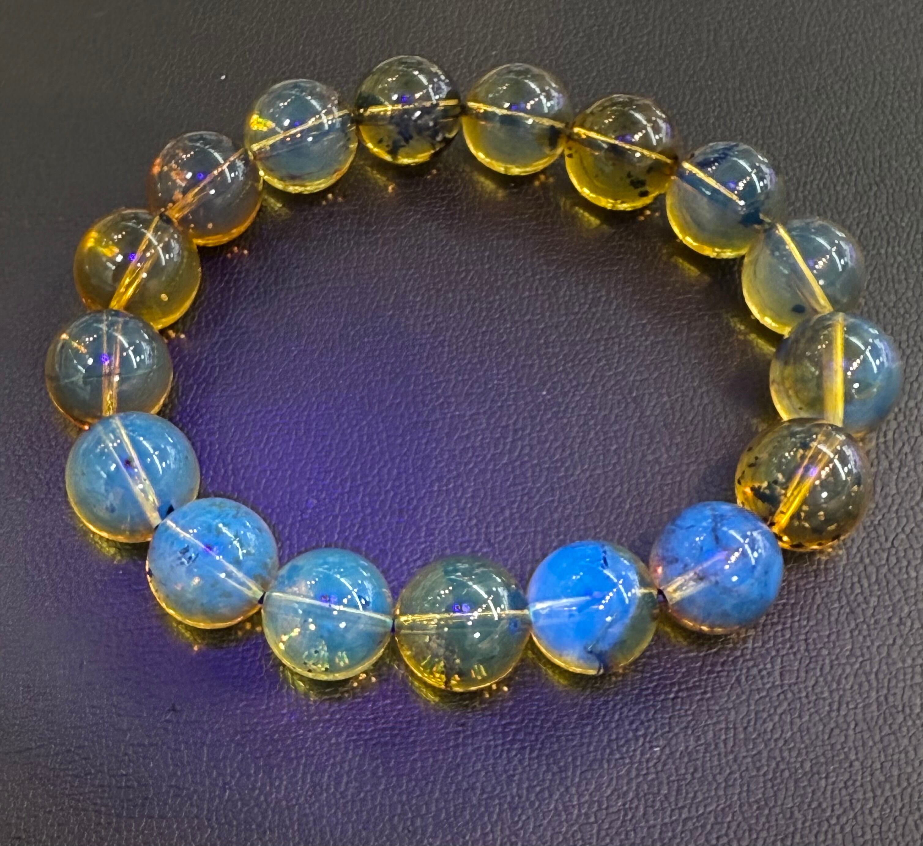 一見普通のアンバーとはなんら変りはないですが、太陽光やブラックライトなどの紫外線が当たると神秘的な美しいブルー光が表面を覆います。