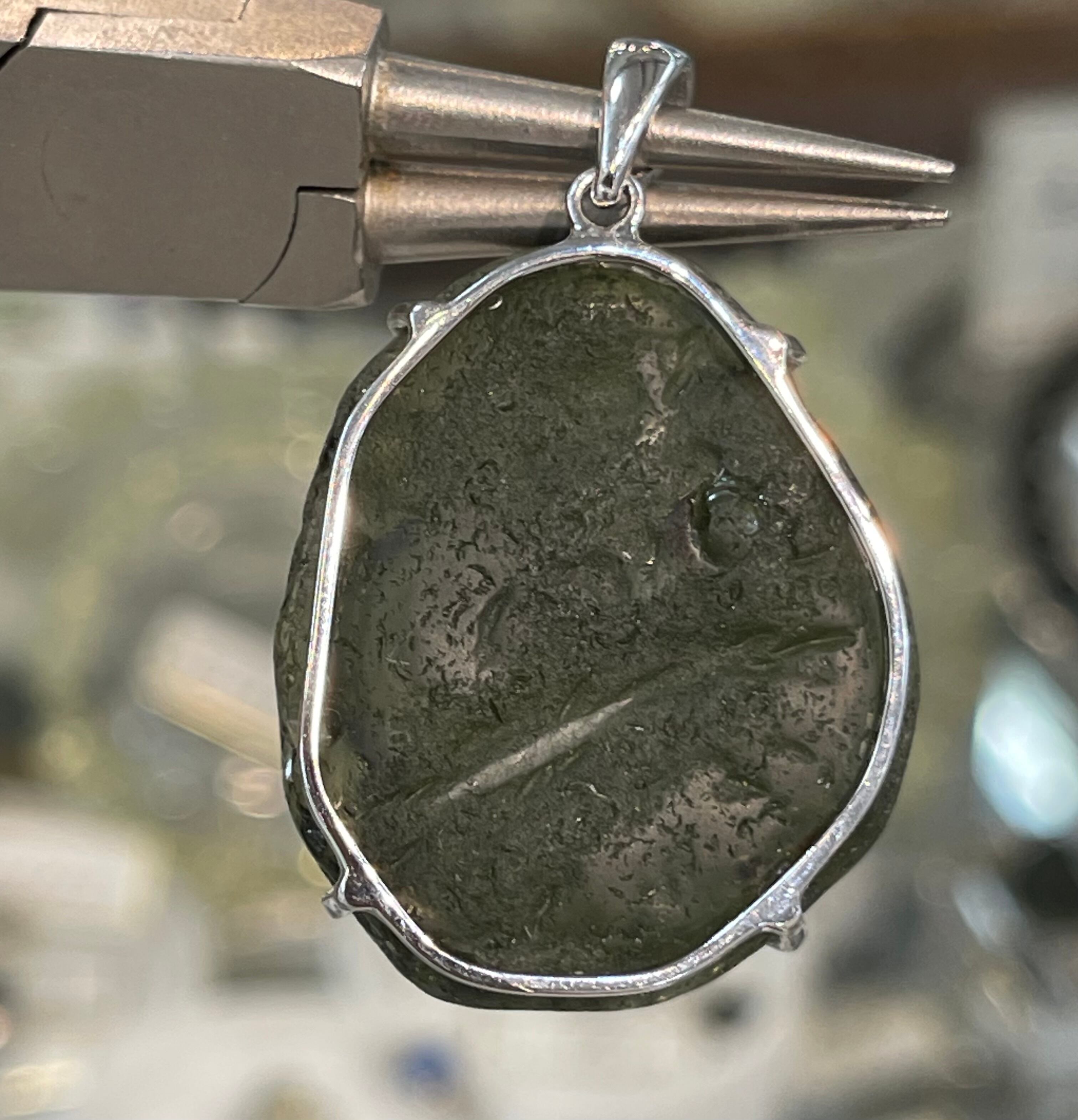 美しいフォレストグリーン色をしていまして、透かすと特にモルダバイト特有の綺麗なダークグリーン系の色合いを見せてくれます。