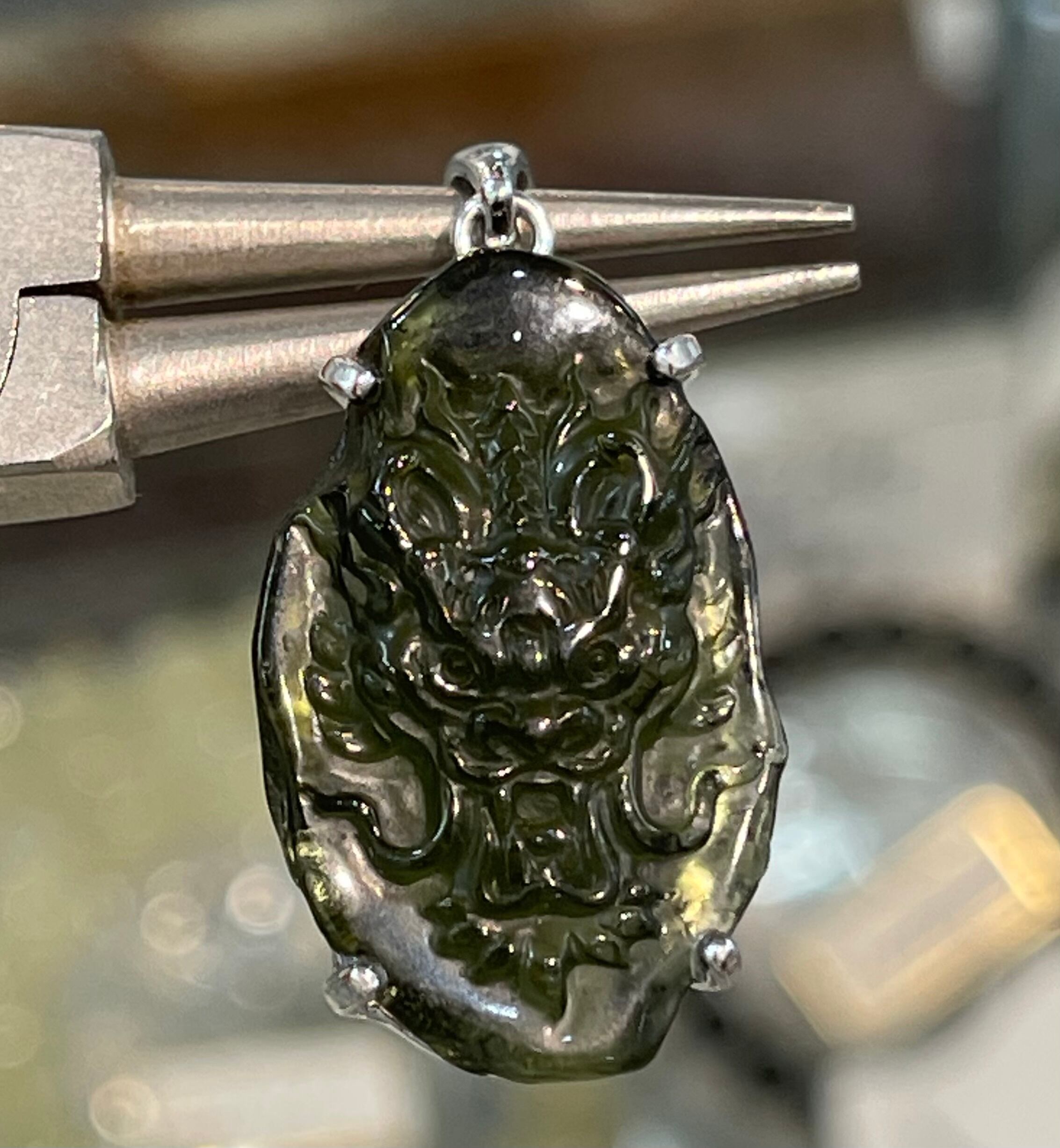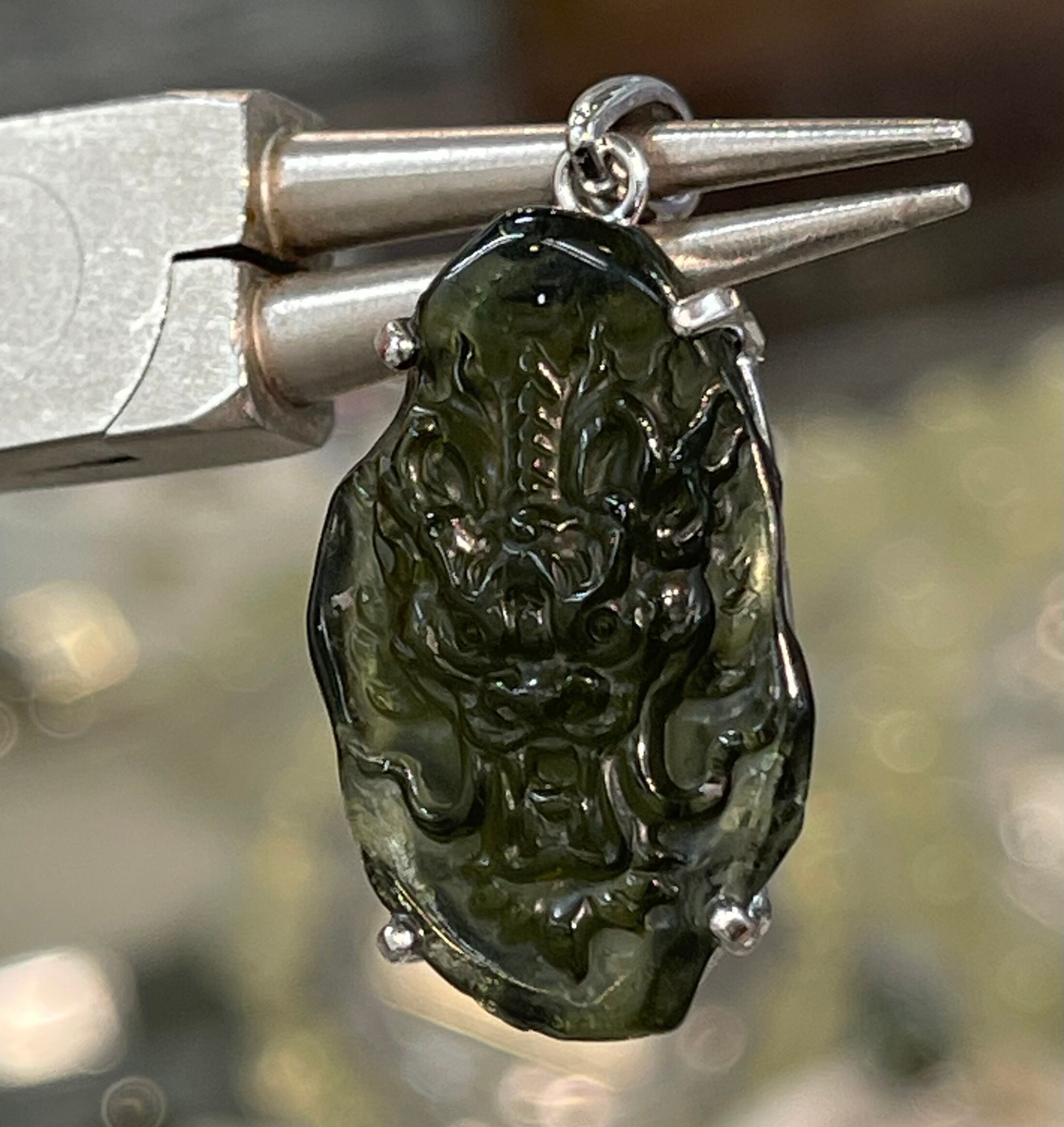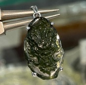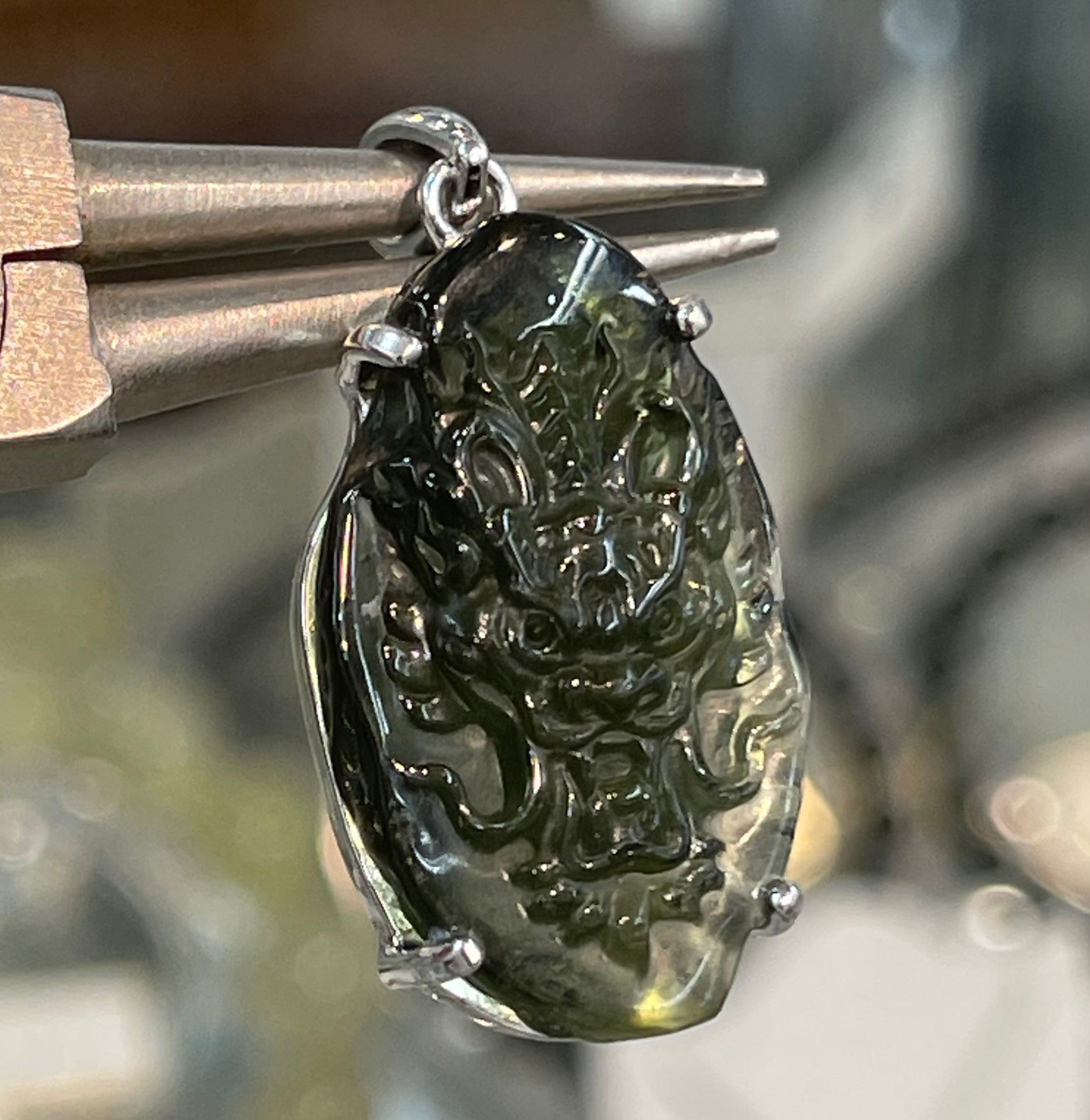 天然モルダバイト原石に熟練の彫刻師が丁寧に仕上げた龍彫りペンダントトップです。
