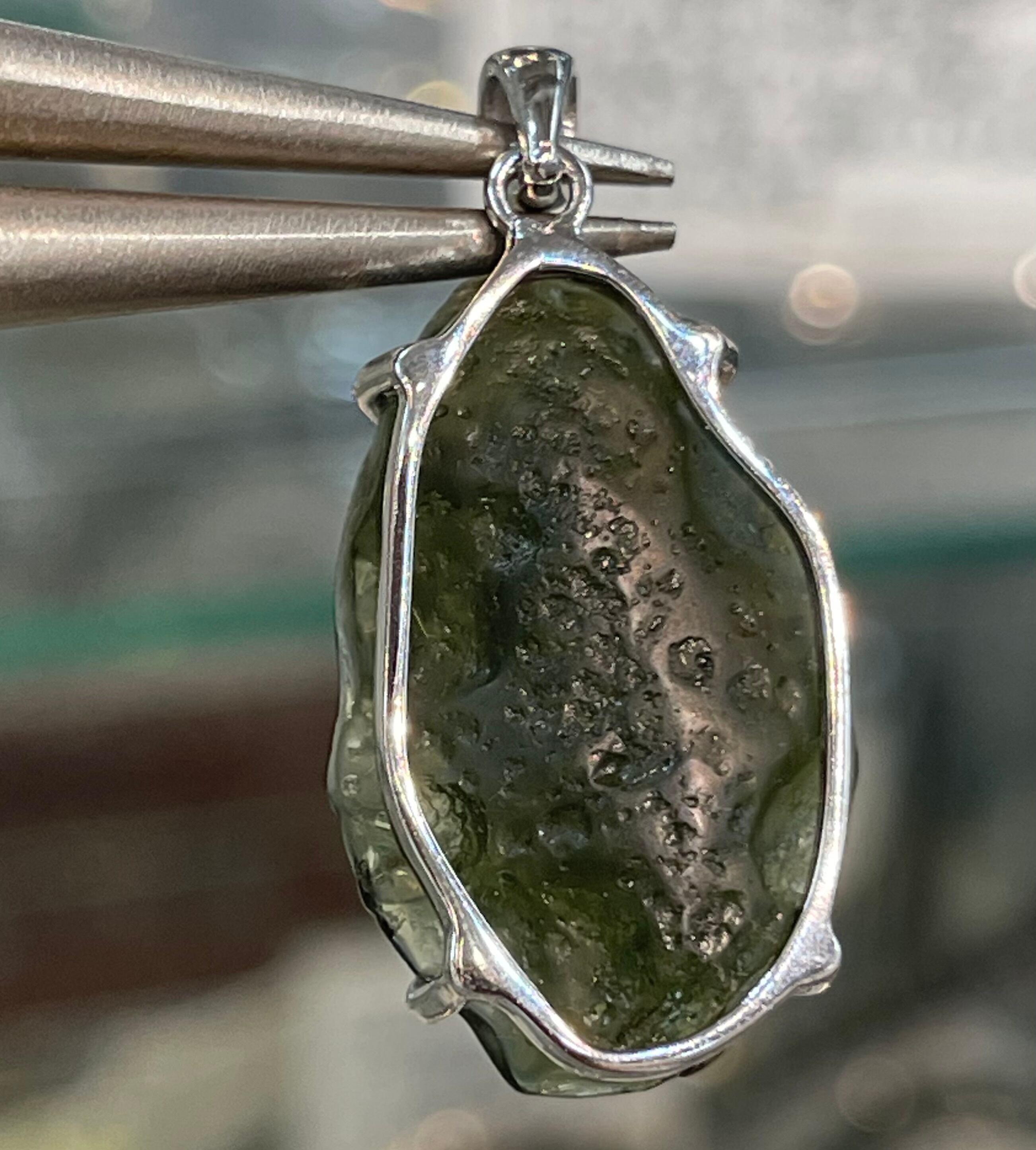 美しいフォレストグリーン色をしていまして、透かすと特にモルダバイト特有の綺麗なダークグリーン系の色合いを見せてくれます。