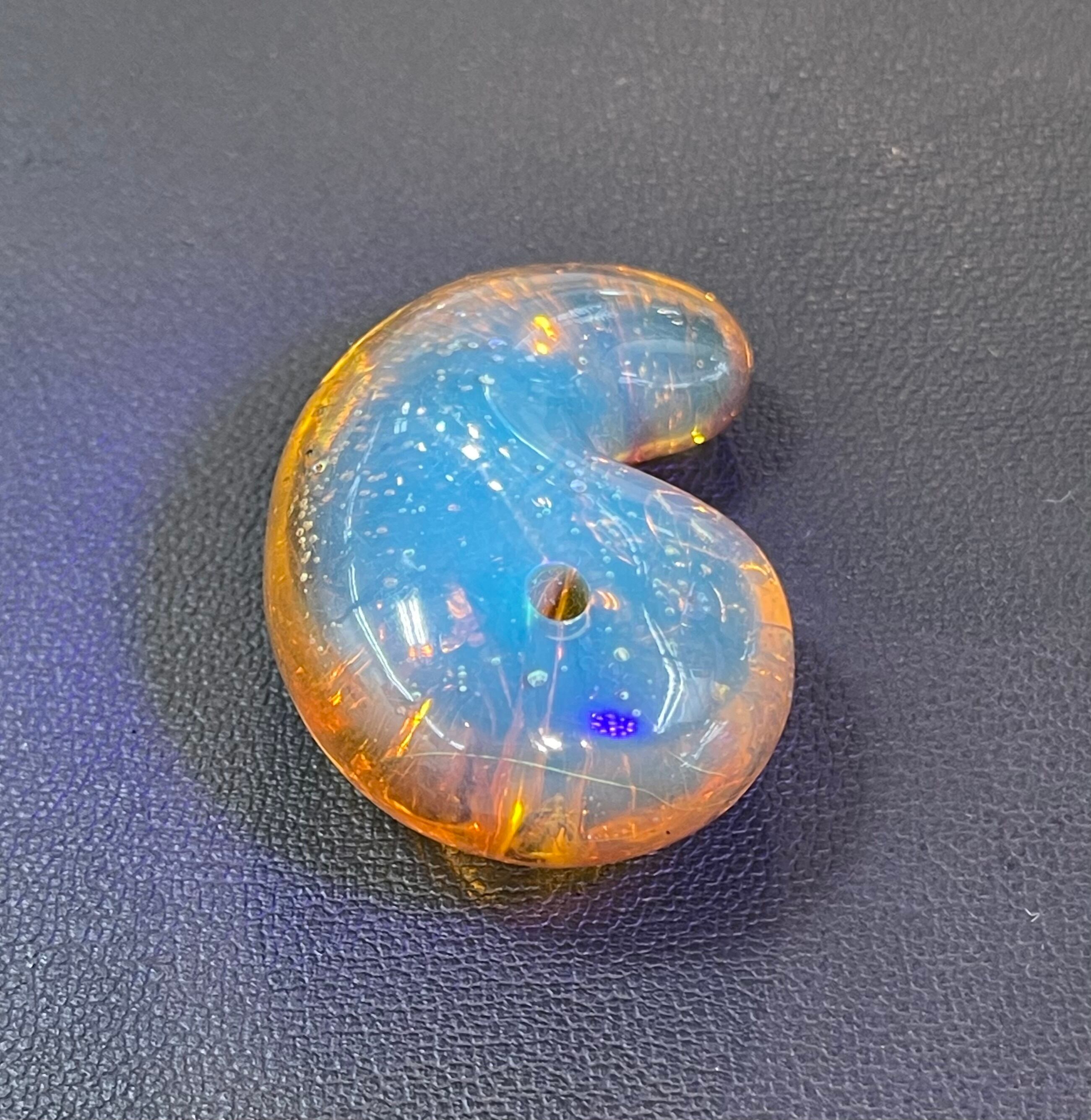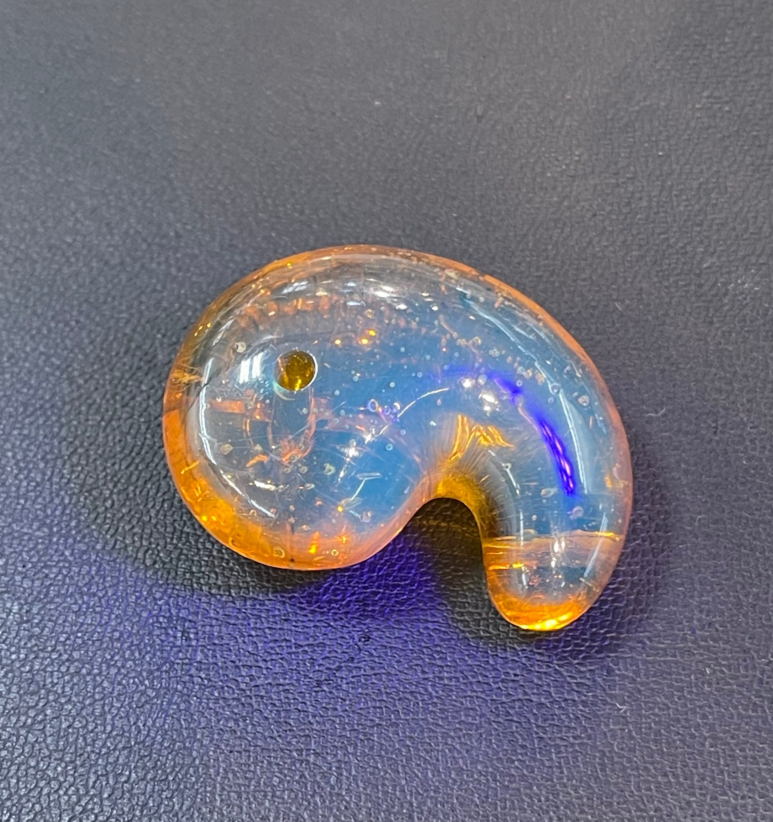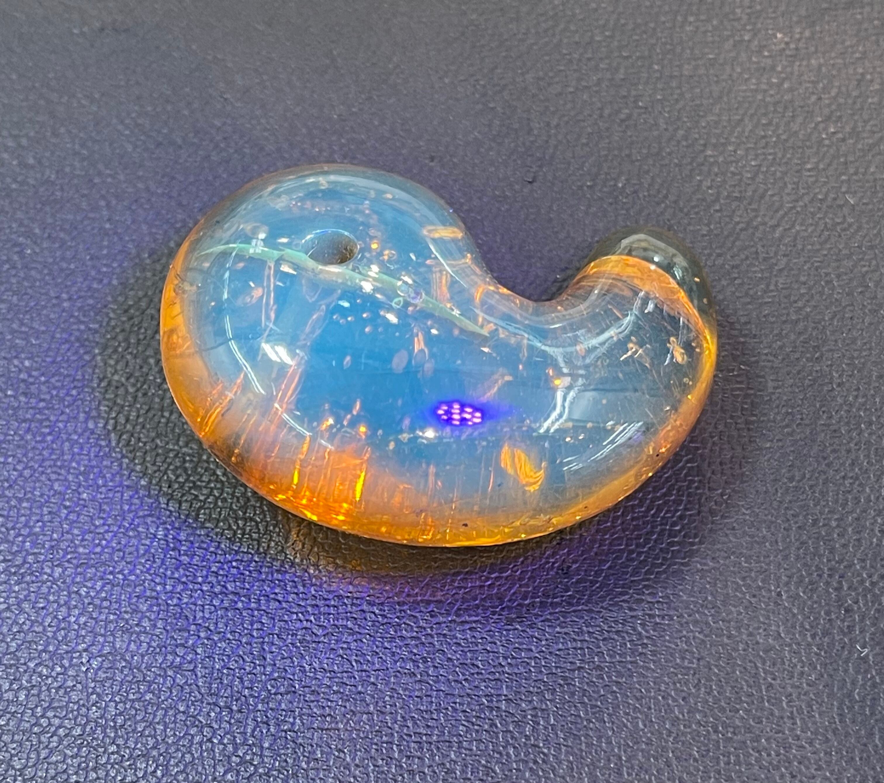 一見普通のアンバーとはなんら変りはないですが、太陽光やブラックライトなどの紫外線が当たると神秘的な美しいブルー光が表面を覆います。