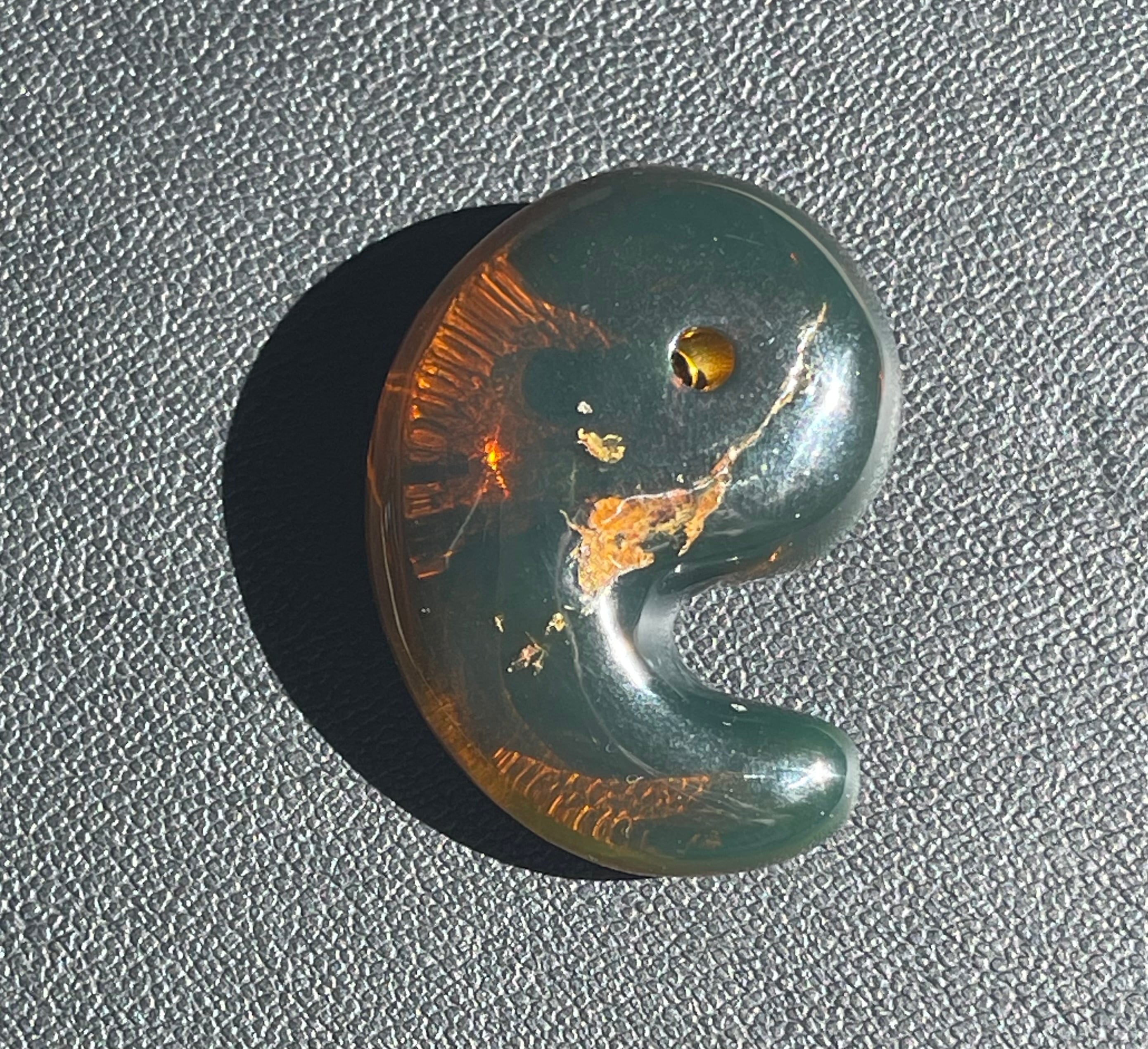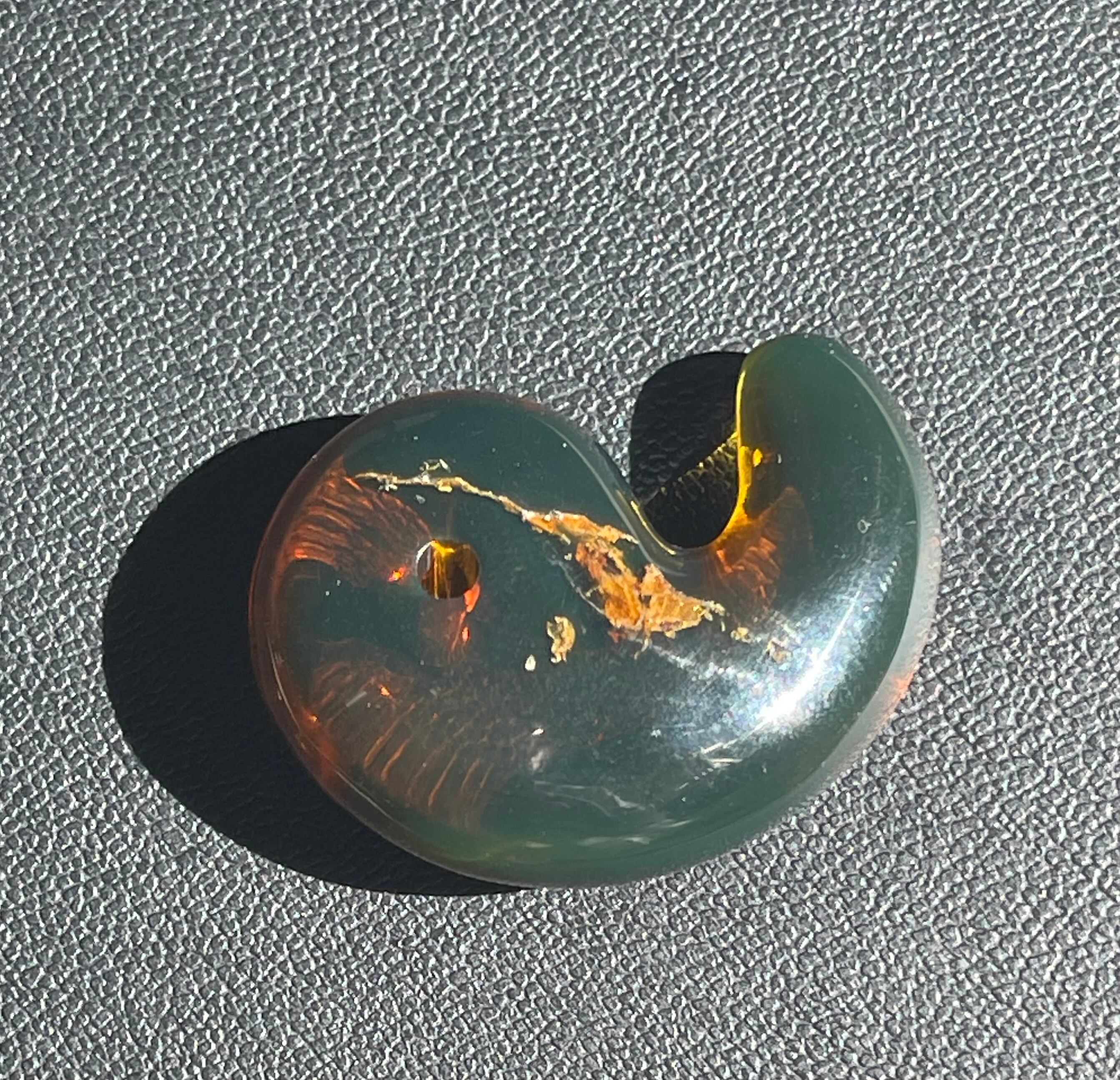 一見普通のアンバーとはなんら変りはないですが、太陽光やブラックライトなどの紫外線が当たると神秘的な美しいブルー光が表面を覆います。